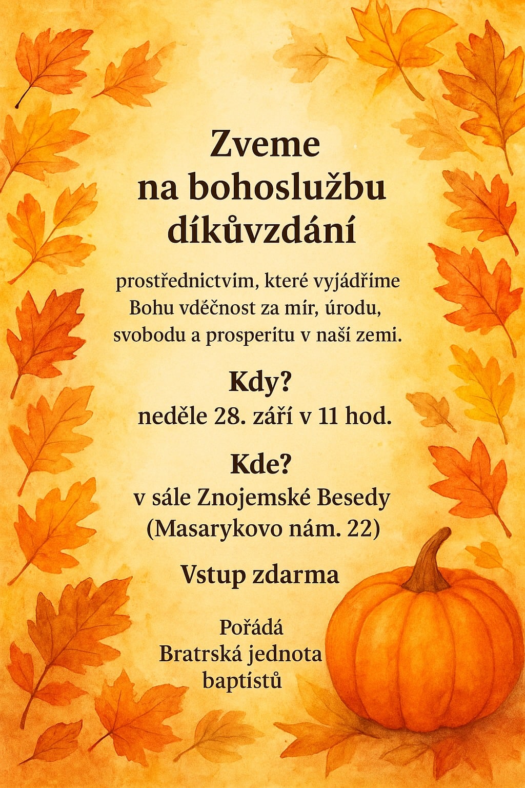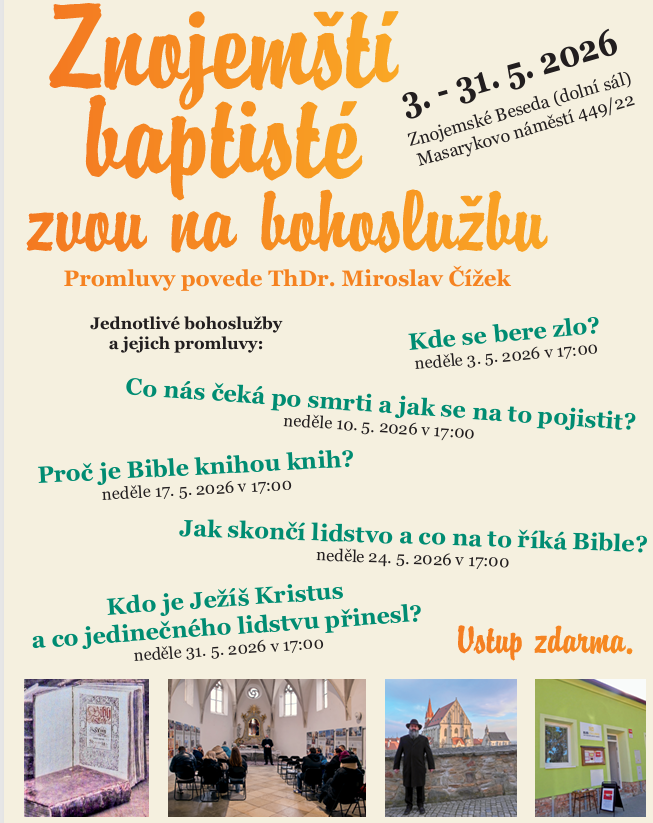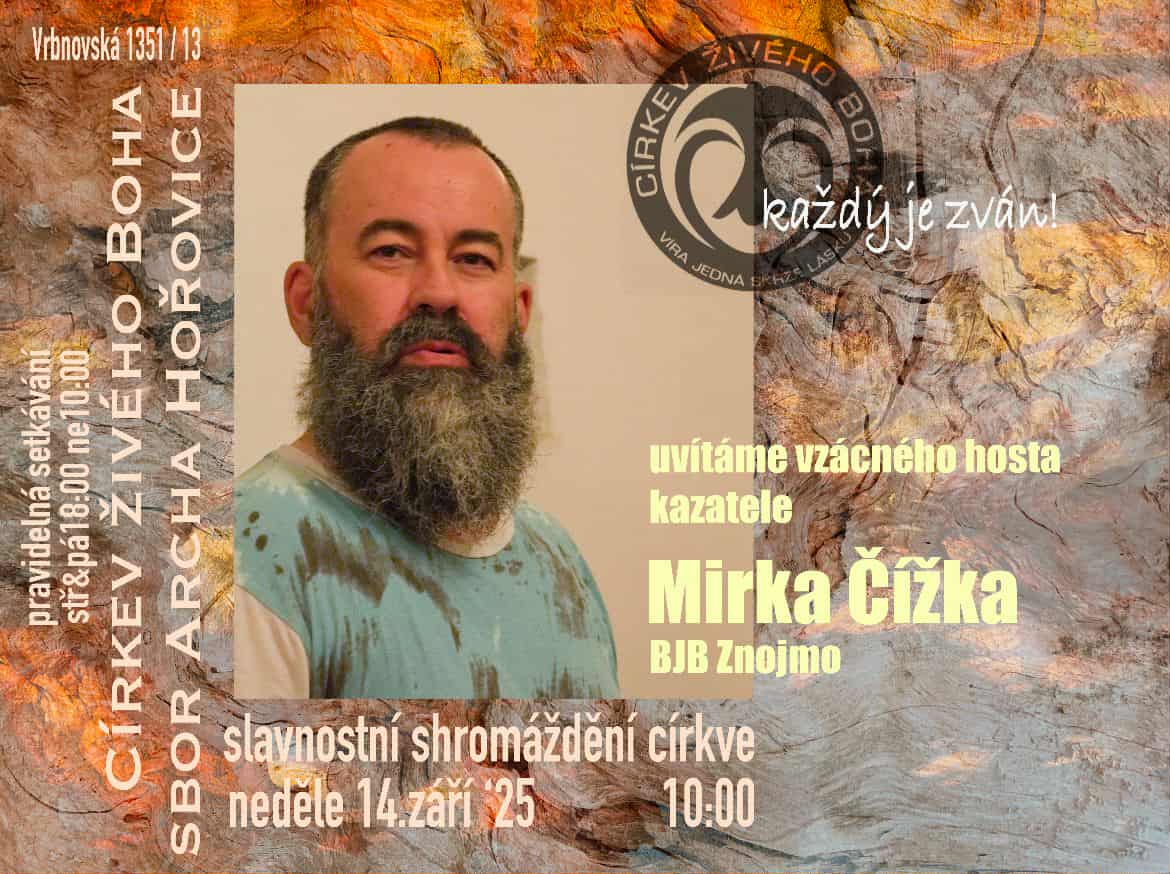 Srdečně vás zveme na slavnostní shromáždění církve, při kterém přivítáme vzácného hosta – kazatele Mirka Čížka z BJB Znojmo. Přijďte společně prožít čas chval, modlitby, povzbuzení a společenství. Každý je srdečně zván.