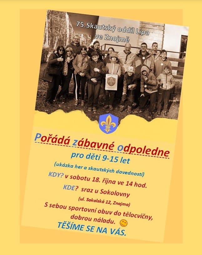 Skautský oddíl Lípa zve děti ve věku 9–15 let na zábavné odpoledne plné her, skautských dovedností a společných zážitků. Přijďte poznat nové kamarády a zažít dobrodružství. S sebou sportovní obuv do tělocvičny a dobrou náladu. Místo: Sokolovna, ul. Sokolská 12, Znojmo